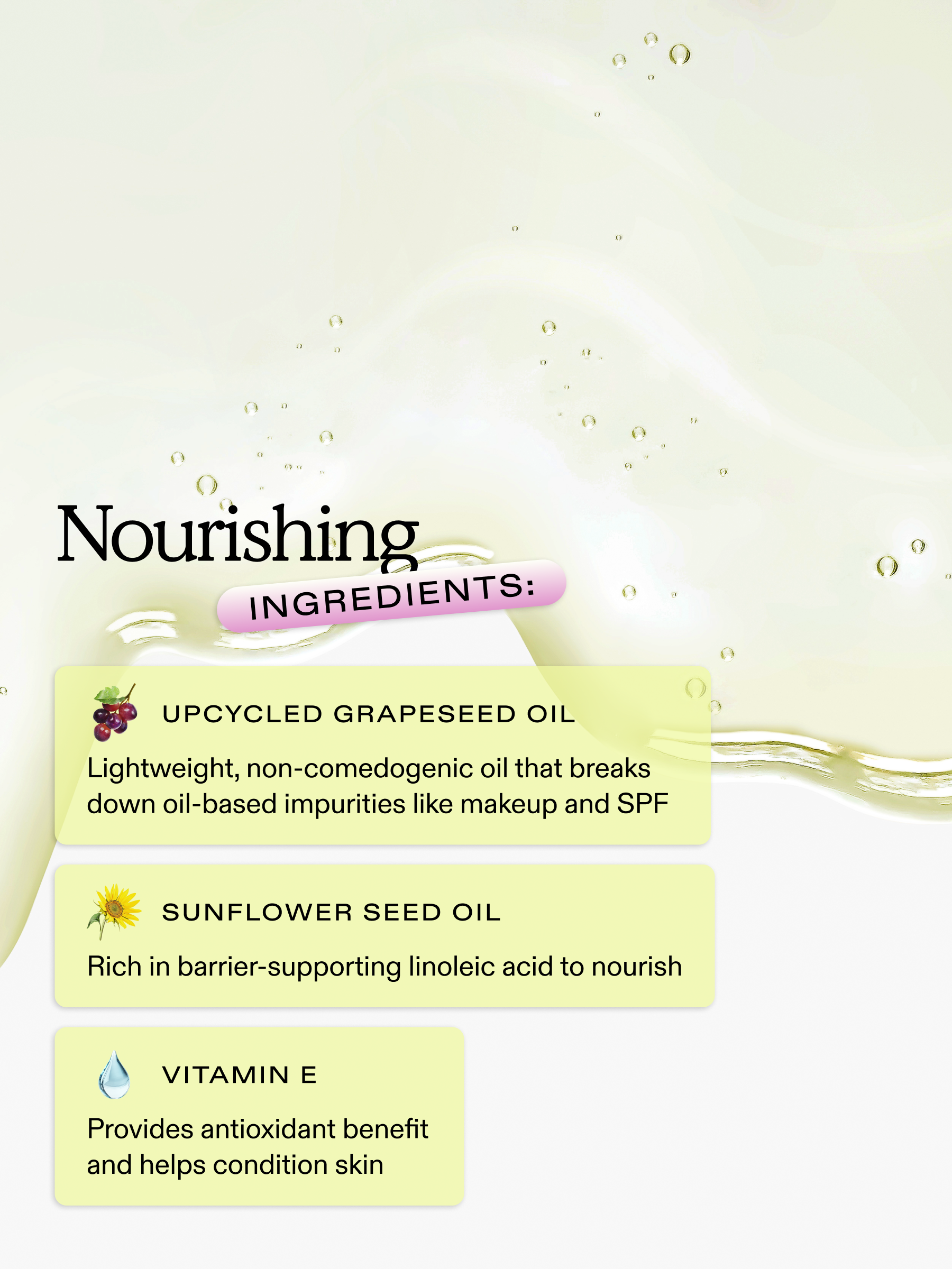 A gentle jelly-to-oil cleanser to dissolve makeup. sunscreen. and impurities with our sustainably-sourced. upcycled Grapeseed Oil. Reveal clean. nourished skin as you melt away the day.?